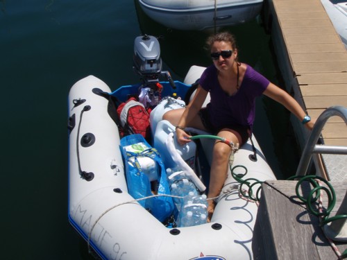 Wieder auf dem Wasser hart an der Überladungsgrenze: Ein Dinghy, viel Proviant und ich muß auch noch mit