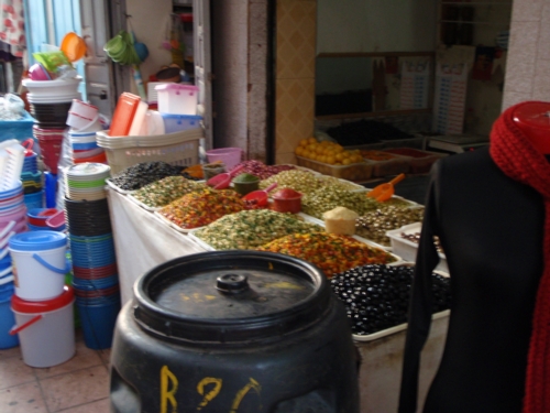 Oliven in allen Varianten (allerdings nicht so viele eingelegte Varianten wie in Deutschland)