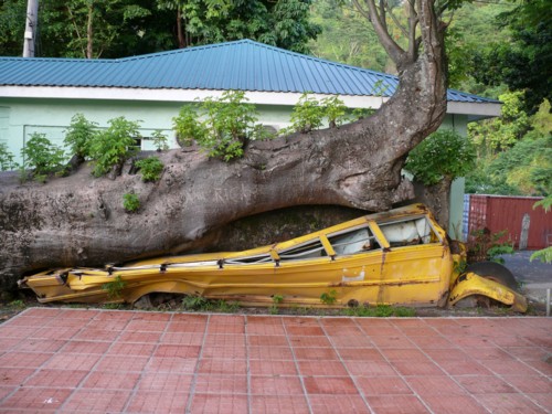 Diesen Bus fanden wir im Botanischen Garten: Hurrican fällt Baum, der kracht auf Bus, überlebt und wächst weiter