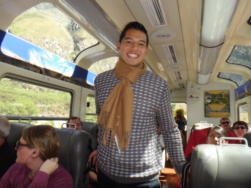 Auf der Zugrückfahrt überrascht uns die Crew mit einer Alpaka-Modenschau! (cs: Das Bild hat Dagmar ausgewählt!)