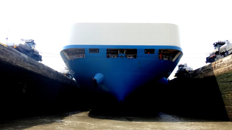 Es dauert eine Weile, bis so ein Gigant in die Schleuse geführt wird und ca. 20m hinter unserem Boot stoppt