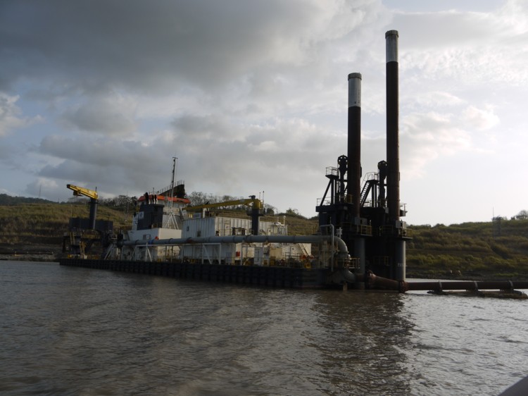 This dredgingfloat is enormous and diggs out the canal not only for maintenance but to make it wider and deeper for the bigger boats to come